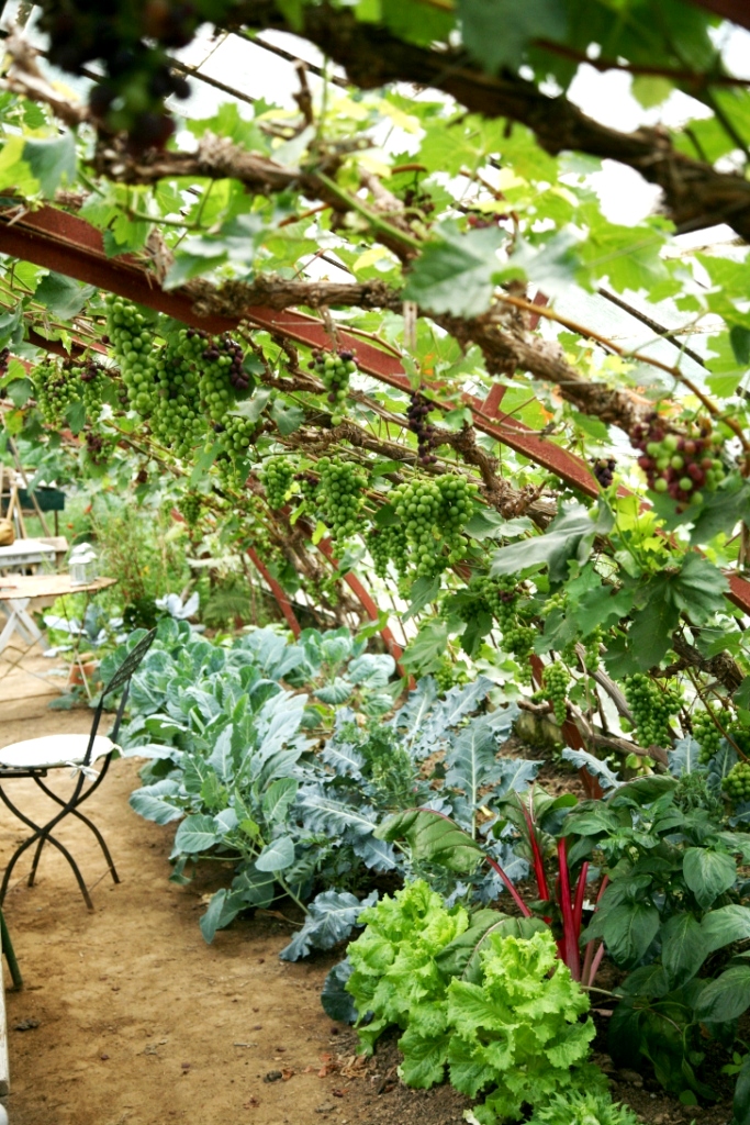 - L’accès à un jardin très varié en permaculture avec différents potagers, verger, grande serre, piscine biologique